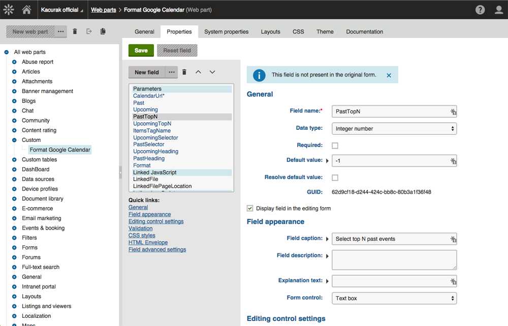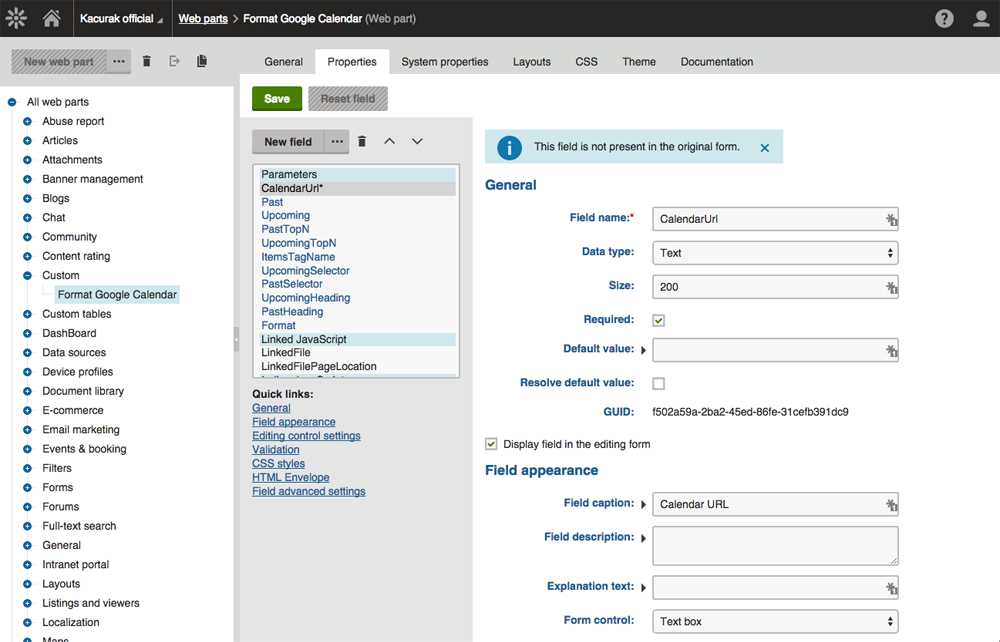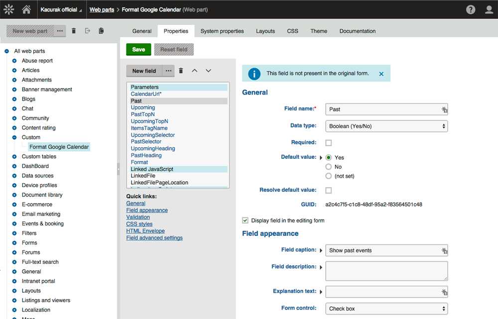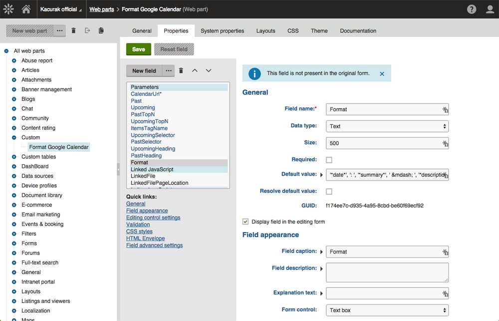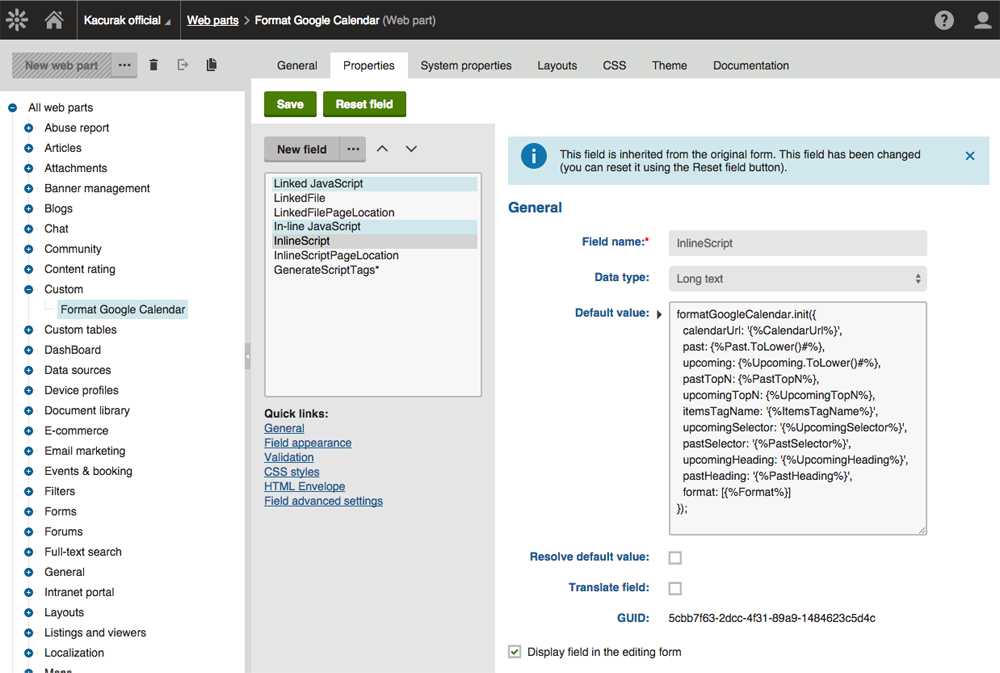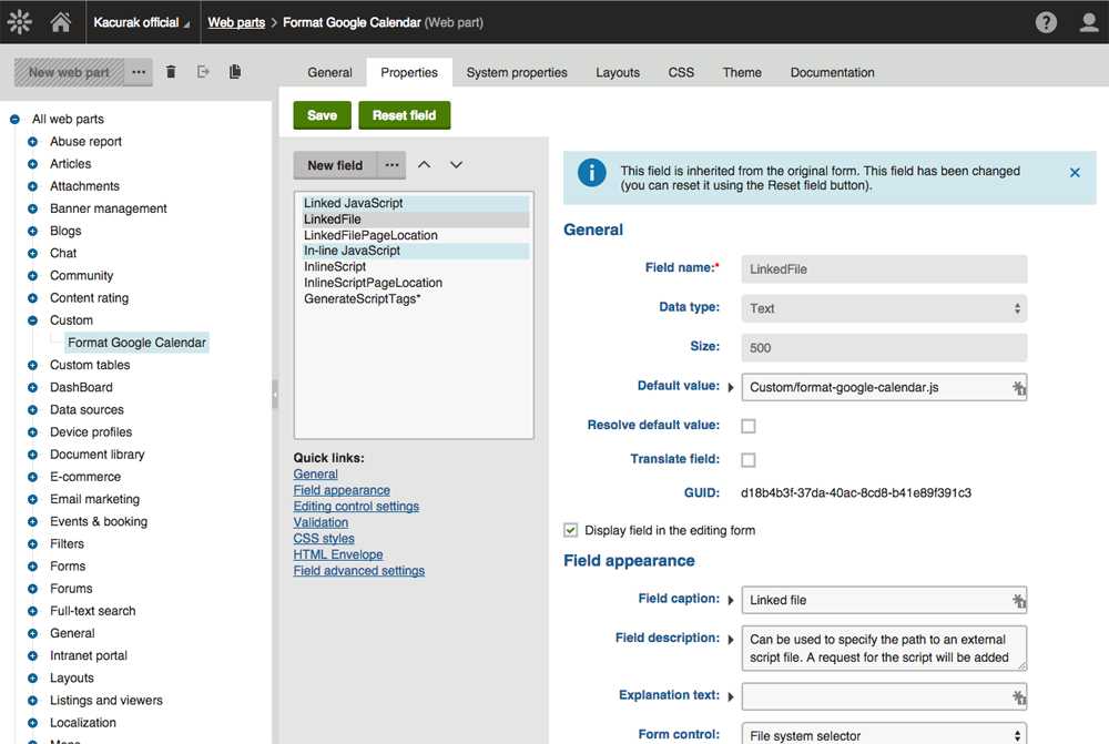 - Go to the Properties tab, select the Linked file field and set Default value to Custom/format-google-calendar.js which is path to the library .js file