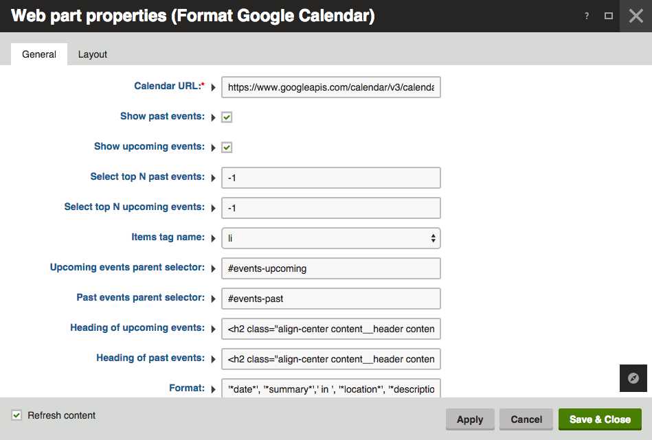 The example of carousel is very common but carousels are too complex to easily explain the beauty of front-end web part approach in Kentico. Let’s go with the Format Google Calendar library which I recently developed and which displays list of events from a Google Calendar. Almost all javascript libraries consist of