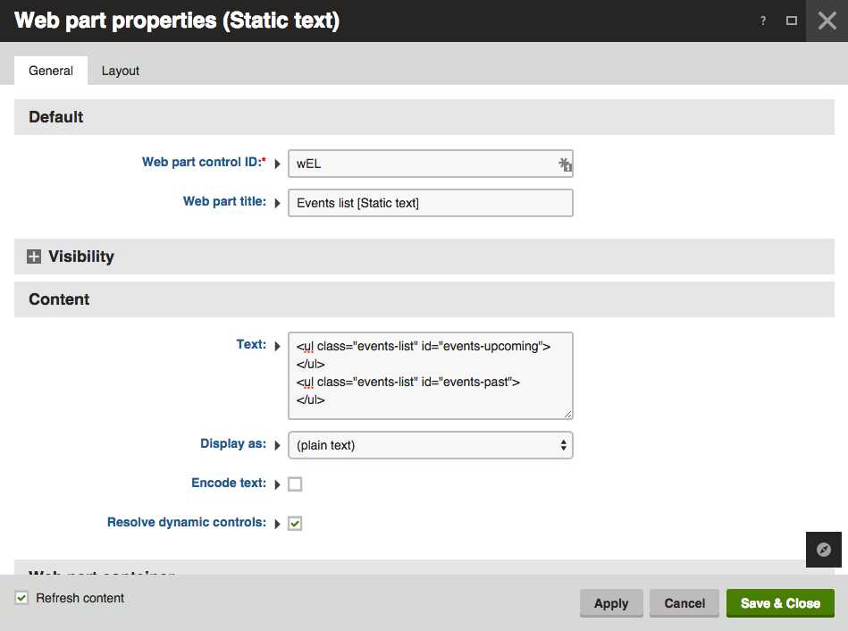 Now these 2 web parts work together and you are sure that any edits to the functionality could be made in the Kentico administration interface. Access to server, Visual studio and knowledge of C# is not needed. Please, use this approach — you save your clients from a lot of pain in the future.