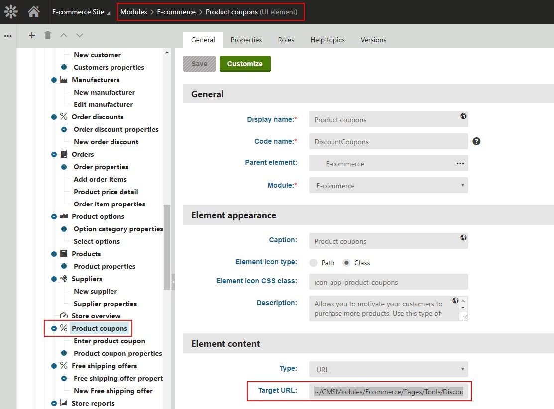 - Switch to the User Interface tab and choose Product coupon in the tree.