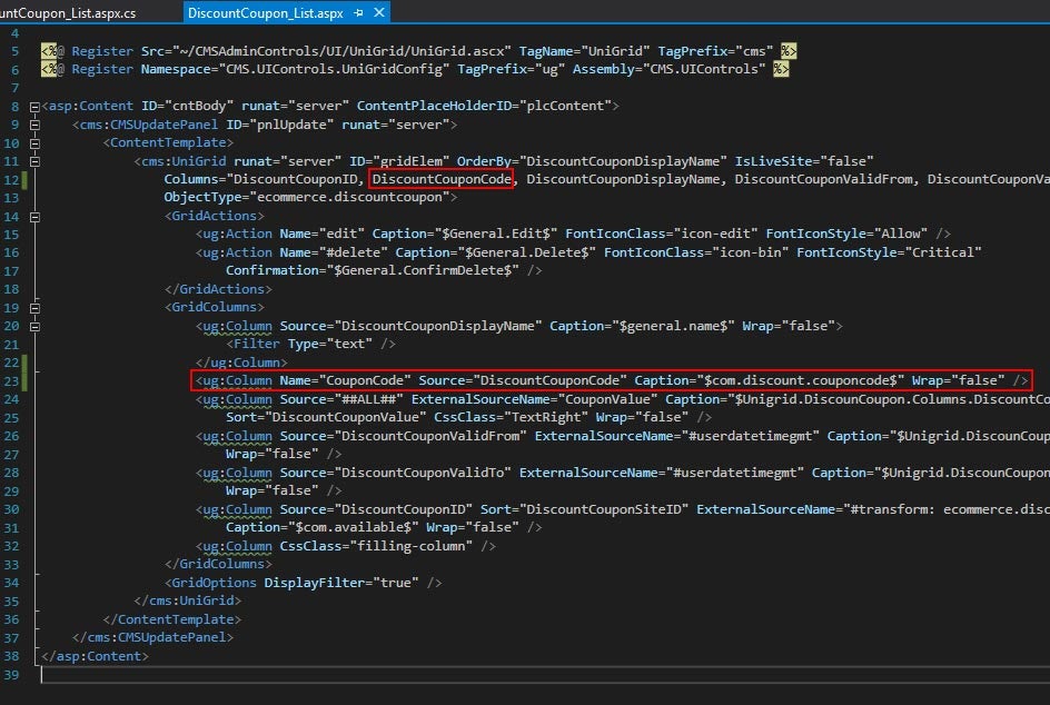We have to tell the UniGrid definition that we need to load the DiscountCouponCode value in data source and add code that represents the column: