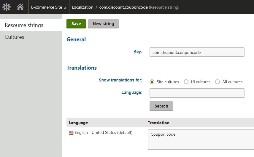 Value of the Caption attribute in the code above $com.discount.couponcode$ represents a localization string that needs to be translated: