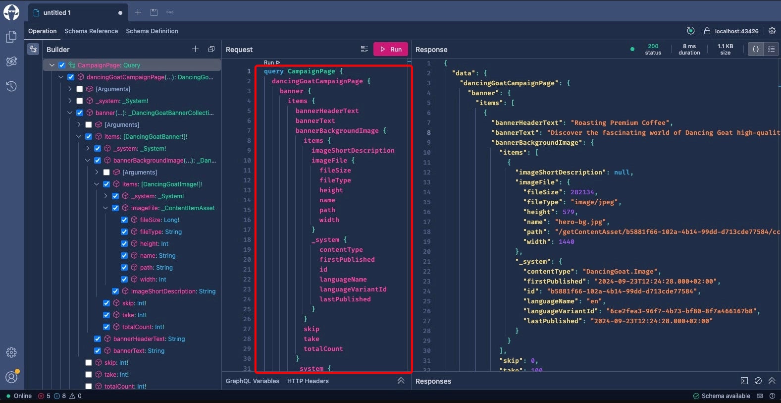 The query we use to fetch Banner data for our Campaign page is stored in lib/graphql/queries/campaign-page.query.graphql. It defines which items and fields need to be fetched. This query can be easily assembled using the UI tool provided with Xperience by Kentico, which we covered in Part 3 of this series.